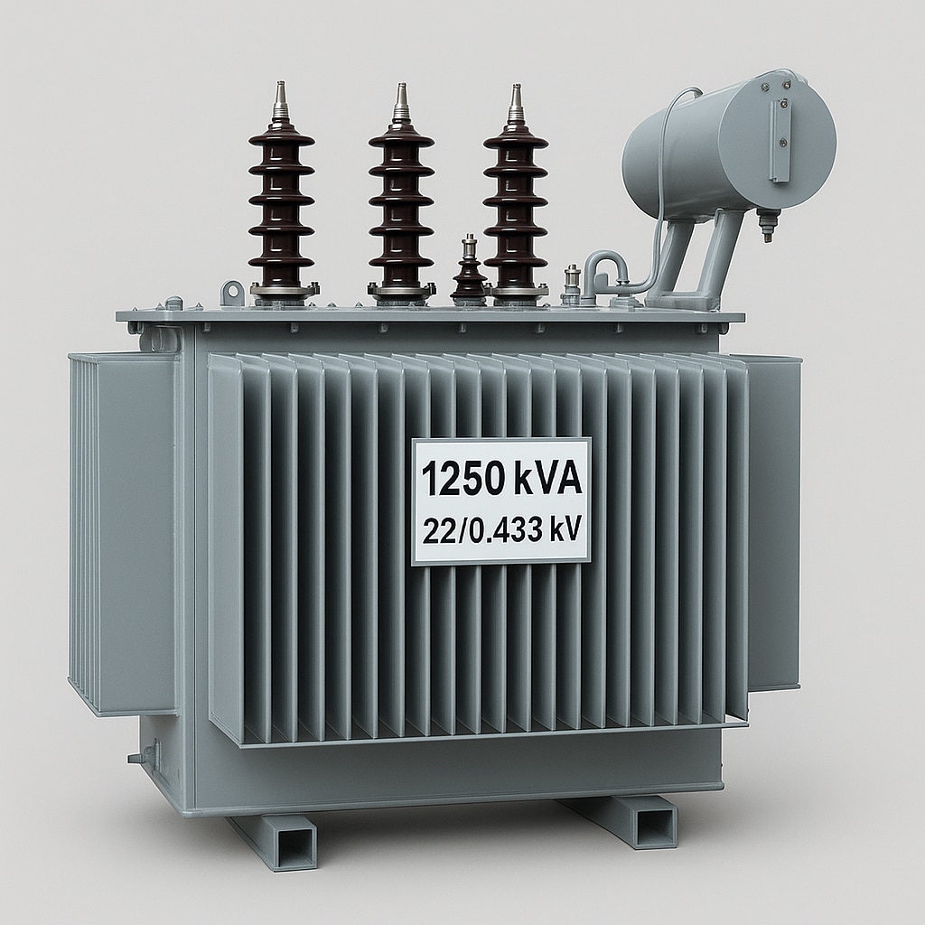 The 1250 kVA, 22/0.433 kV Distribution Transformer is a three-phase, oil-immersed power distribution unit designed for reliable medium-voltage to low-voltage power conversion. It is widely used in commercial, industrial, and utility distribution networks to step down 22 kV high voltage to 433 V for end-user distribution. The transformer features high-grade copper windings, robust insulation, and efficient cooling to ensure long-term performance with minimal losses. Manufactured as per IS/IEC standards, it offers excellent voltage regulation, high short-circuit strength, and enhanced energy efficiency for continuous load operations.